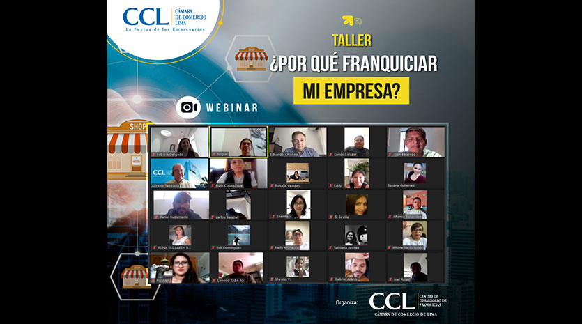 El Centro de Desarrollo Empresarial de Franquicias de la Cámara de Comercio de Lima (CCL), liderado por Alfredo Taboada, organizó el taller ¿Por qué franquiciar mi empresa?. Dicho webinar fue dictado por los consultores de Franchise Master Group, Fabiola Delgado y Eduardo Chianea, quienes, durante la sesión, dieron a conocer los beneficios de invertir en franquiciar la propia empresa a largo plazo. El taller contó con la participación de 56 personas, entre ellos empresarios de medianas empresas y público en general.