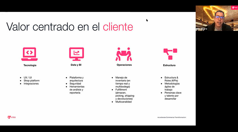 El Gremio de Retail organizó el webinar: Comercio Colaborativo y nuevas funcionalidades para el e-Commerce. La exposición estuvo a cargo de Nilo Alfaro Gonzales, head of sales VTEX, quien abordó temas relacionados a la teoría de valor, valor centrado en el cliente digital y comercio colaborativo, entre otros. Alfaro dio a conocer los beneficios del uso de marketplace, entre los cuales resaltan la expansión de mercado, reducción de gastos generales e incremento de ingresos. El webinar culminó mostrando éxitos nacionales e internacionales.
