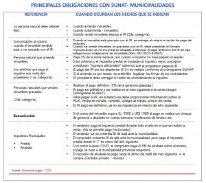 Las personas naturales, sociedades conyugales y sucesiones indivisas que transfieren inmuebles gravados y no gravados con el Impuesto a la Renta (IR), deben cumplir con 20 obligaciones tributarias con la Superintendencia Nacional de Aduanas y de Administración Tributaria (Sunat) y los municipios según las normas vigentes, informó la Cámara de Comercio de Lima (CCL).