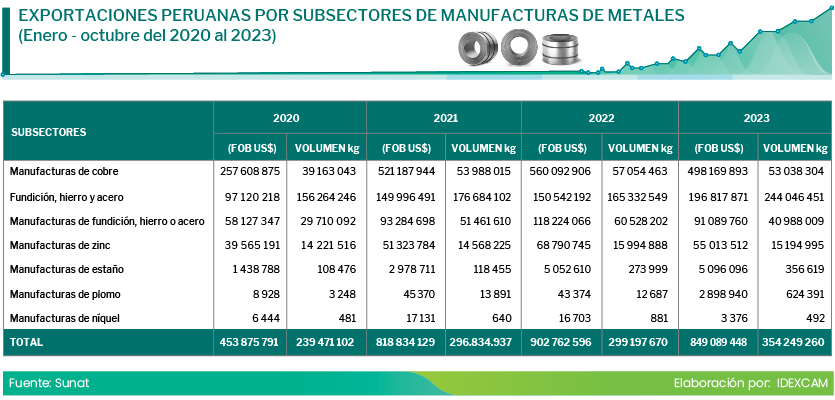 Entre enero y octubre de 2023, las exportaciones peruanas de manufacturas de metal cayeron 6 % en valor y crecieron 18 % en volumen, con respecto a similar periodo de 2022. Este comportamiento se atribuye en gran medida a la contracción económica de los principales destinos de exportación como Estados Unidos, Colombia, Ecuador y Bolivia.