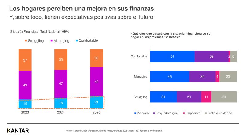 Según el estudio un 30 % de los hogares se encuentran dentro del grupo de Struggling; mientras que un 49 % está en Managing, y 21 % en Comfortable. Podemos observar también que dentro del grupo Comfortable, un 51 % considera que su situación económica mejorará en el presente año. Del 2024 al 2025 más hogares ingresaron en la categoría Comfortable y Managing (3 y 2 p.p. respectivamente).