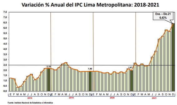 Cabe resaltar que, de acuerdo a datos del  Instituto Nacional de Estadística e Informática (INEI), el Índice de Precios al Consumidor en Lima Metropolitana cerró el 2021 en su mayor nivel de los últimos 13 años, al incrementarse 6,43% durante el 2021, muy por encima del 1,97% del 2020, y también superando el rango meta del Banco Central de Reserva de entre 1% y 3%.