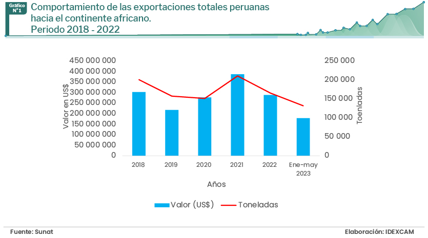 En el año 2022, se enviaron 165 695 toneladas de productos peruanos al continente africano, cifra 21 % menor con respecto al año anterior. En cuanto al valor exportado, este cayó 25 %. Ambas caídas se debieron a menores envíos de los sectores Minería y Siderometalúrgico.