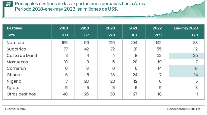 Entre los años 2018 al 2022, los principales destinos africanos de las exportaciones peruanas fueron Namibia, Sudáfrica y Costa de Marfil.