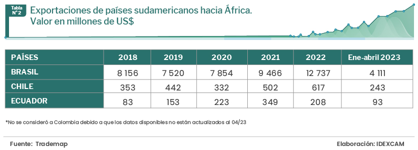En cuanto a Chile, los efectos de la pandemia podrían haber afectado sus envíos hacia el continente africano, pues en el 2020, se evidenció una caída de 25% respecto al 2019. Las exportaciones de este país hacia África se recuperaron en el 2021 y mantuvieron un desempeño positivo en el 2022, destacando los envíos de jurel congelado por US$ 274 millones.