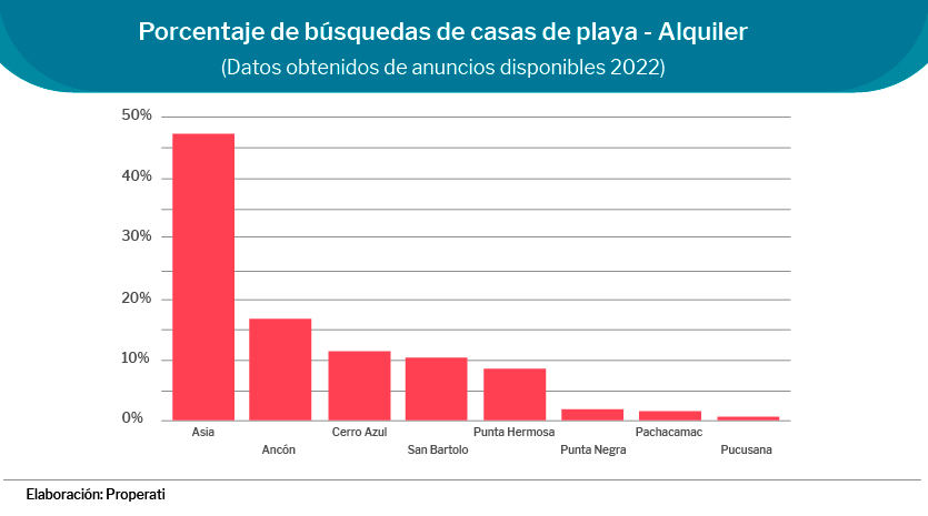 De otro lado, Properati, la plataforma digital de bienes raíces, señala que la búsqueda para alquilar casas de playa para 2023 mantiene una tendencia estacional. Refiere que, desde agosto, las búsquedas por viviendas de este tipo se han incrementado en distritos como Ancón, Cerro Azul, Asia, San Bartolo y Punta Negra y los lugares que destacan son Asia y Punta Negra, que presentan un nivel similar o superior a septiembre en solo los primeros 15 días de octubre.