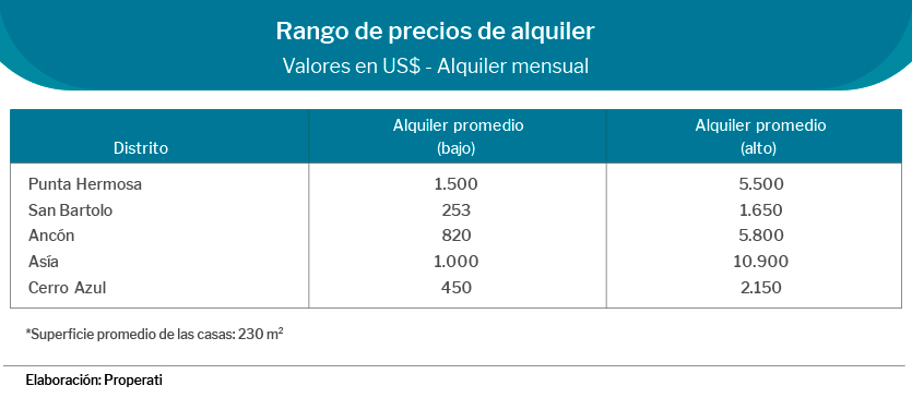 Para Lucy Mier y Terán, del sector de Bienes Raíces de la CCL, la oferta varía para casas en renta con áreas que van desde los 115 hasta los 1.000 m². Precisa que los arriendos mensuales tienen un rango entre los US$ 1.600 a US$ 8.000. Con respecto a departamentos, la oferta y demanda va en incremento y la renta mensual es de USS 2.500 en promedio y semanal de aproximadamente US$ 750, llegando a un precio máximo de US$ 1.200 en la playa Santa María.