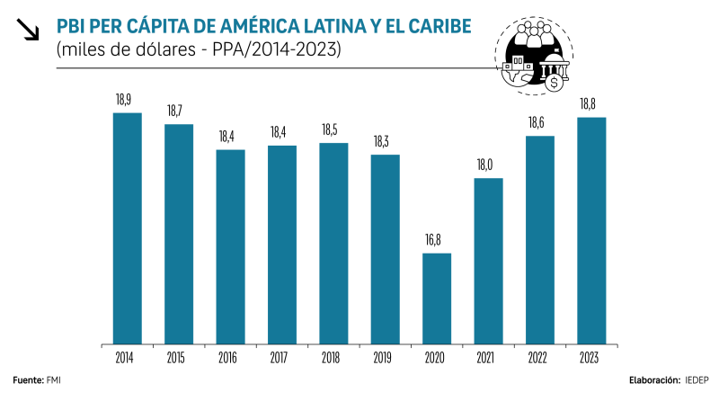 Desde entonces, la región ha experimentado una recuperación gradual, impulsada por la reactivación económica, políticas fiscales y monetarias expansivas, y la adaptación al entorno postpandemia. Según el Fondo Monetario Internacional (FMI), en 2023, el PBI per cápita alcanzó los US$ 18 849, un nivel comparable al periodo previo a la crisis. No obstante, sigue siendo apenas el 30 % del promedio de los países avanzados, lo que evidencia la brecha estructural de la región.