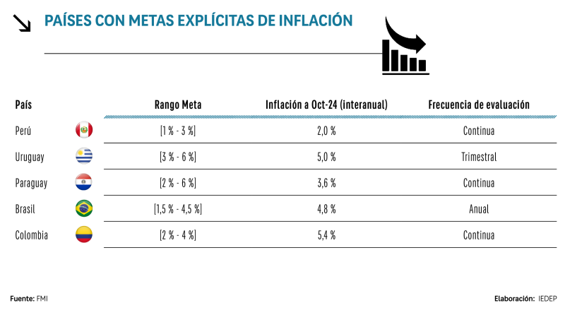La inflación en América Latina ha seguido una tendencia descendente desde 2022, aunque con diferencias notables entre países. En octubre de 2024, Perú (2 %), Uruguay (5 %) y Paraguay (3,6 %) lograron situarse dentro de sus rangos meta, mientras que Brasil (4,8 %), Colombia (5.4 %) permanecieron fuera de sus objetivos. No obstante, a pesar de estas diferencias, todos los países evidencian una tendencia general hacia una menor inflación.