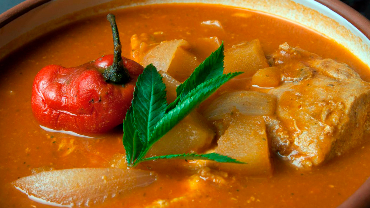 Esta delicia de carne de cerdo también es súper famoso. Consiste en un guiso de cerdo, bien concentrado, servido a la manera de caldo, en un plato hondo. Y se sirve acompañado del famoso pan de tres puntas. Es uno de esos platos reponedores. Se suele preparar en los alrededores de la Plaza de Caima.