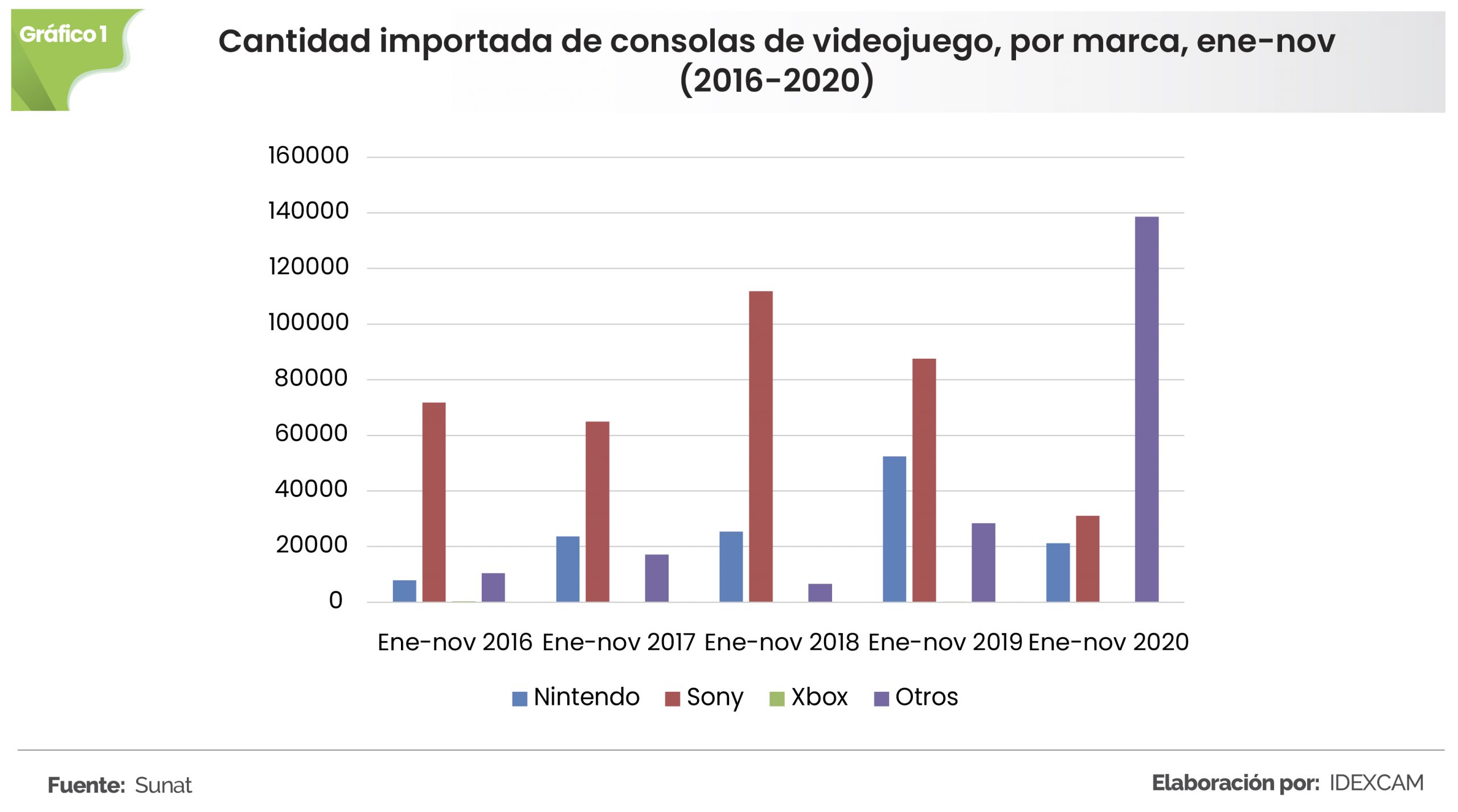 Sumando la cantidad importada entre enero y noviembre de todo el periodo analizado (2016-2020), se observa que las consolas de la marca Sony son las más populares en el Perú, 367.074 unidades, ello se debería a que, las entregas de Play Station 1 y 2 eran accesibles para cualquier familia, ya sea de ingresos altos, medios o bajos, pues sus juegos son fáciles de copiar, lo que consolidó la marca en el mercado.