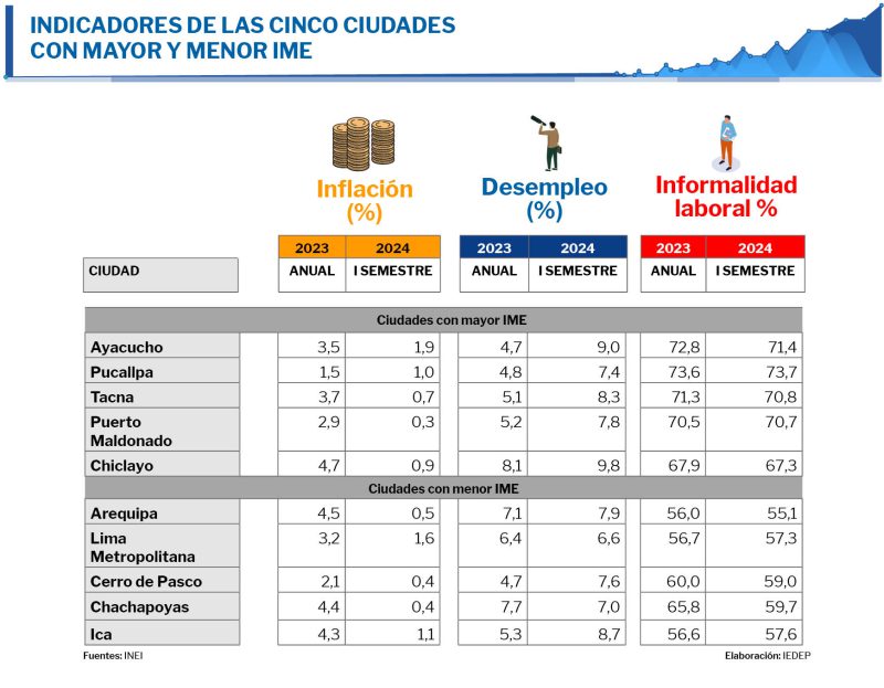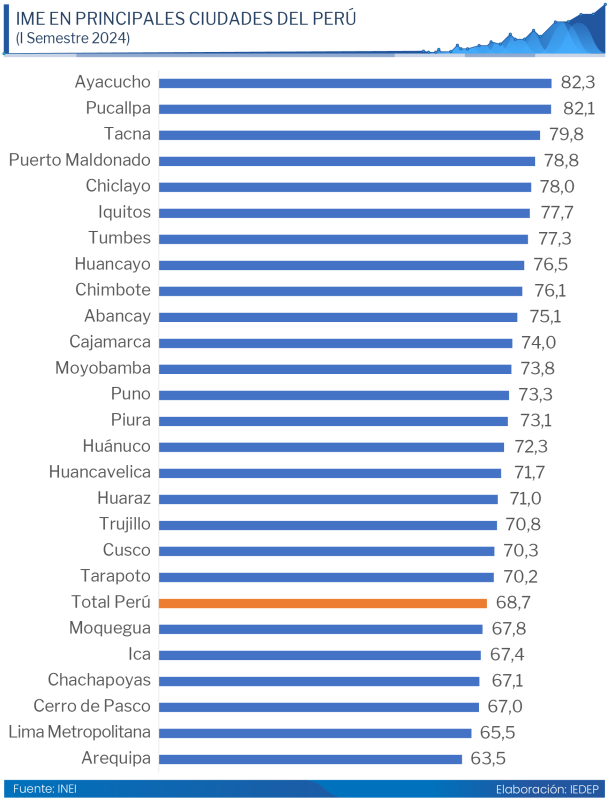 Al primer semestre de 2024, el IME a nivel nacional fue de 68,7 puntos, con 20 ciudades por encima de dicho promedio, lo que indica un mayor nivel de malestar económico. Las ciudades con mayores índices fueron Ayacucho (82,3), Pucallpa (82,1) y Tacna (79,8). En todas ellas, la informalidad laboral supera el 70 %, registrando los niveles más altos del país.