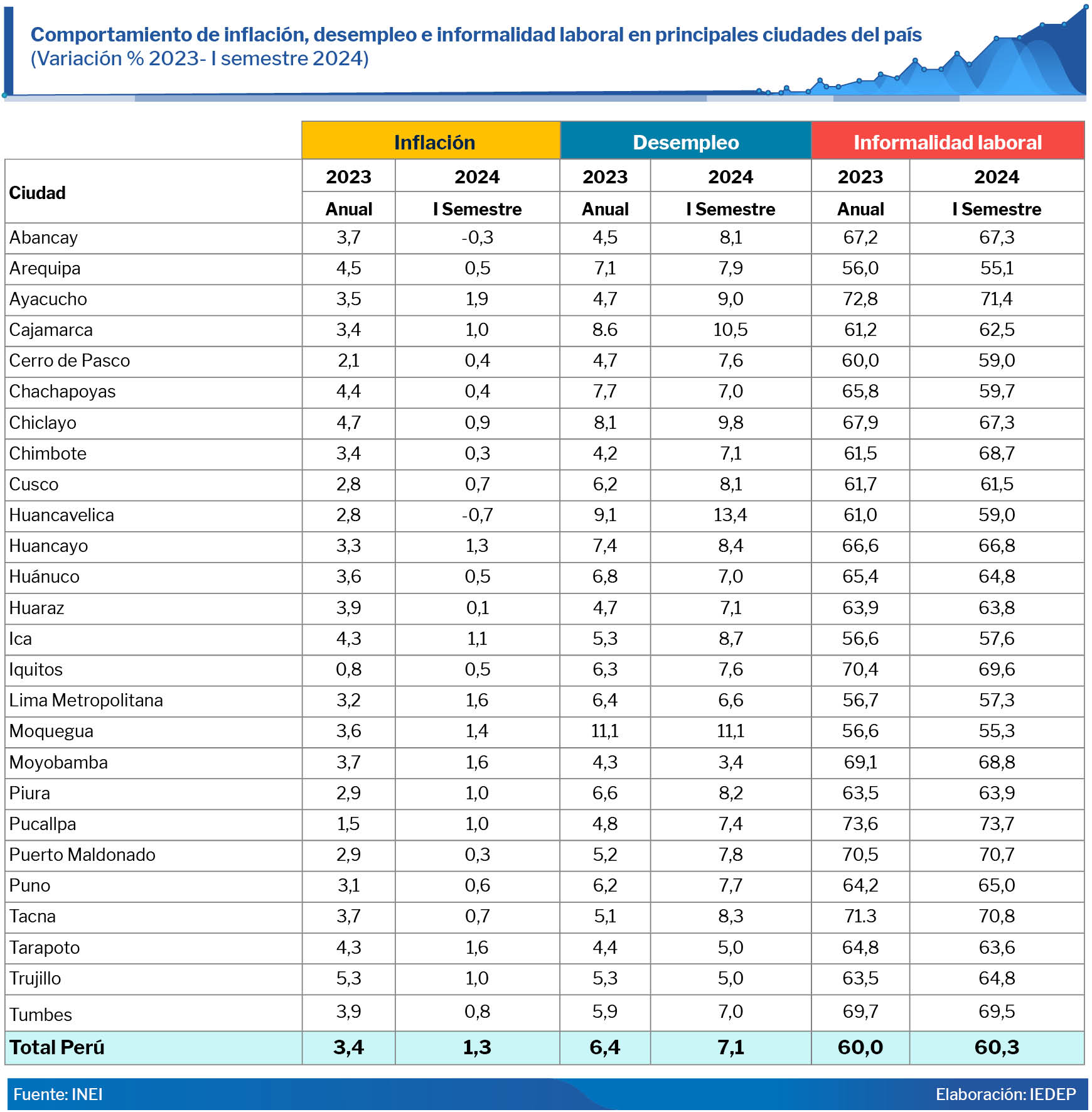 El desempleo impacta negativamente en el consumo de los hogares, aumenta la pobreza y genera una mayor demanda de servicios sociales. Estos efectos varían según la estructura económica de cada ciudad. En el primer semestre de 2024, el desempleo en Perú mostró un incremento generalizado respecto al cierre del 2023, afectando significativamente a varias ciudades principales. Huancavelica registró el mayor incremento, subiendo del 9,1 % a 13,4 %, seguida de Cajamarca (8,6 % a 10,5 %) y Chiclayo (de 8,1 % a 9,8 %). Otras ciudades como Abancay, Ayacucho y Cusco también experimentaron aumentos importantes en su desempleo.
