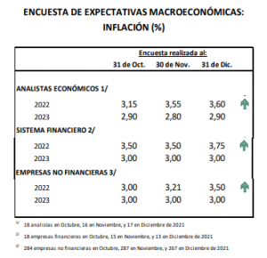 Para 2022, los analistas económicos mantuvieron su expectativa de tasa de interés de referencia en 3,25% y las entidades financieras aumentaron su expectativa a 3,50%.