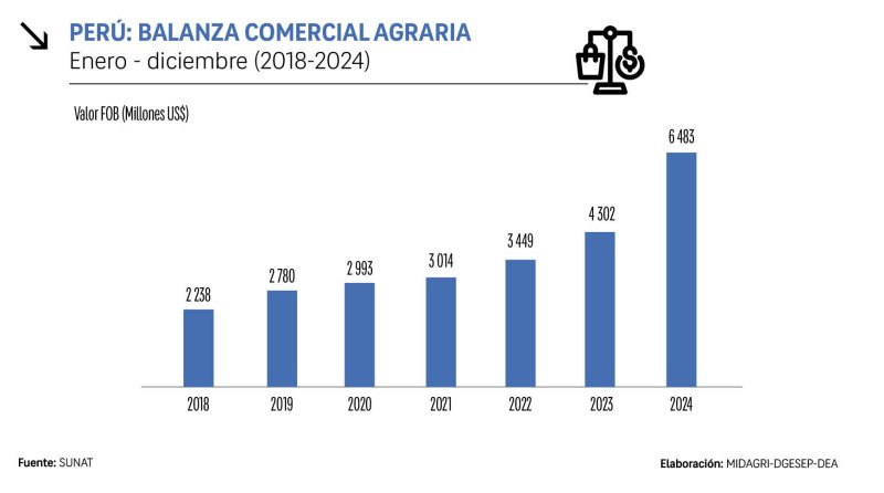Las agroexportaciones peruanas han alcanzado un nuevo hito. Según el Ministerio de Desarrollo Agrario y Riego (Midagri), en 2024, las ventas totalizaron US$ 12 784 millones, un crecimiento del 22,1 %, respecto a similar periodo de 2023.
