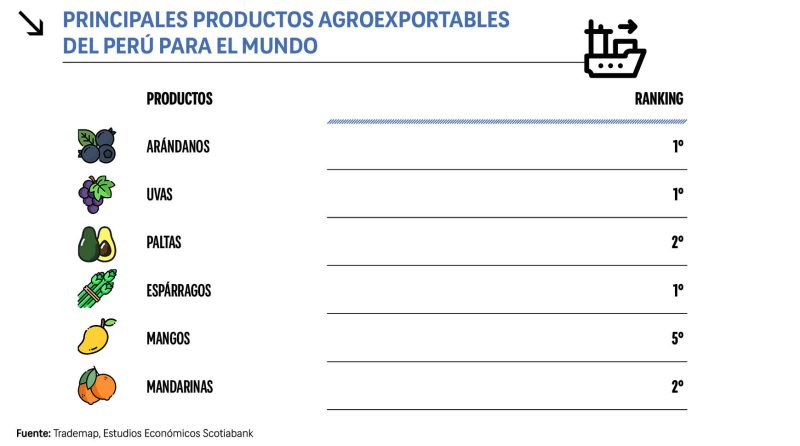 “Esperamos que las agroexportaciones continúen aumentando en 2025. Esperamos un crecimiento de alrededor del 5 %, siempre que no se incluyan aranceles a estos productos”, precisa la representante del Departamento de Estudios Económicos de Scotiabank.