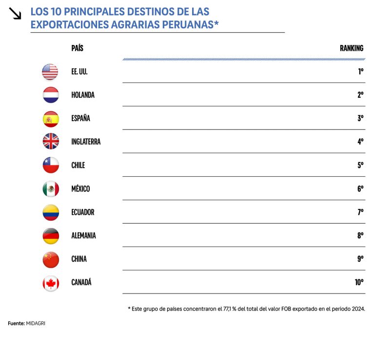 De igual manera, el representante del Gremio de Comercio Exterior de la CCL señala que el Ministerio de Economía y Finanzas estima que las exportaciones agrarias no serán menores a US$ 12 000 millones en 2025. “Este optimismo se sustenta en el incremento del 8 % en el presupuesto asignado al Ministerio de Desarrollo Agrario y Riego, destinado a fortalecer la producción agropecuaria y mejorar la infraestructura agrícola”, agrega.