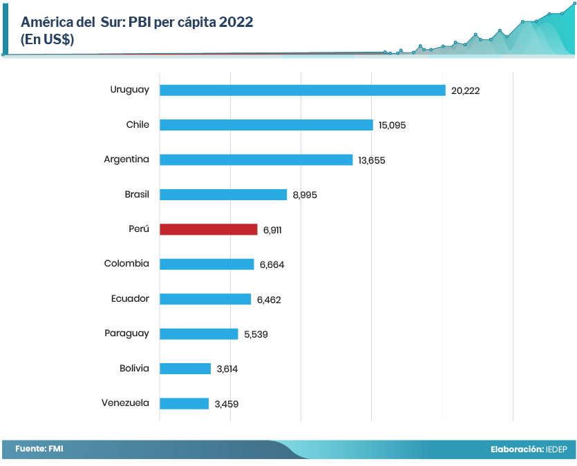 Perú, como país, tiene un PBI per cápita de US$ 6.911, lo que nos ubica en el puesto 91 en el mundo entre 193 países. En la región, es la quinta economía, superada por Uruguay, Chile, Argentina y Brasil.