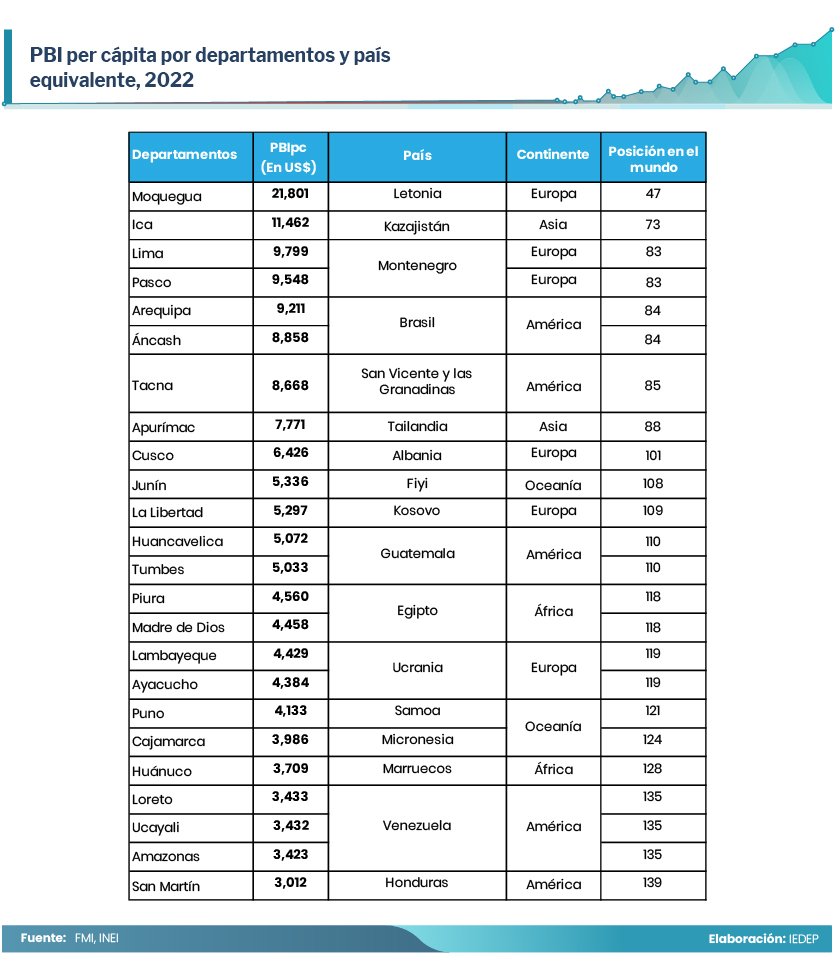 El departamento con mayor PBI per cápita en el país es Moquegua con US$ 21.801, con un monto aproximado al de Letonia (US$ 22.348). Este país es considerado como una economía avanzada por el FMI, se encuentra en el límite inferior del primer cuartil y se ubica en la posición 47º en el mundo.