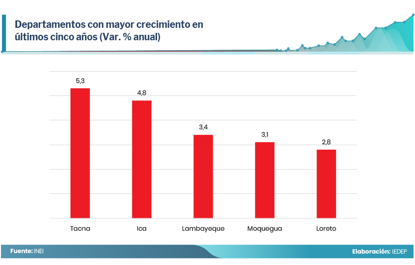 Estas mismas características se encuentran dentro de un mismo territorio. Si bien el Perú tiene un crecimiento bajo, proyectado en 2% para el presente año, esto no sucede en cada uno de los 24 departamentos que conforman el país. Por ejemplo, en los últimos cinco años destacaron por su mayor crecimiento promedio Tacna con una tasa del 5,3% anual, Ica con un 4,8%, Lambayeque con un 3,4%, Moquegua con un 3,1% y Loreto con un 2,8%. Entretanto Lima solo crecía 1,9%.
