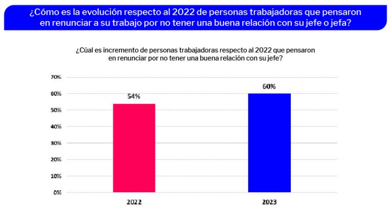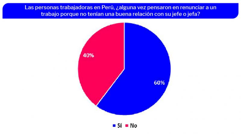 Una investigación realizada por Bumeran reveló que la relación con el jefe sigue siendo un factor crítico en la estabilidad laboral de los peruanos. El estudio “Líderes o jefes” evidenció que el 60 % de los peruanos ha considerado en algún momento renunciar a su trabajo debido a la mala relación con su jefe. Este porcentaje representa un aumento de 6 puntos porcentuales respecto a la edición anterior del estudio en el 2022, donde el 54 % de los encuestados había enfrentado esta situación.