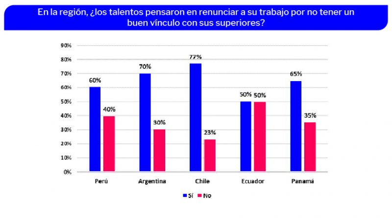 En otros países de la región también se observa la misma tendencia. En Chile, un 77 % de las personas encuestadas indicaron haber considerado renunciar a su trabajo debido a su relación con sus superiores. En Argentina, este porcentaje fue del 70 %; en Panamá, del 65 %; y en Ecuador, del 50 %.