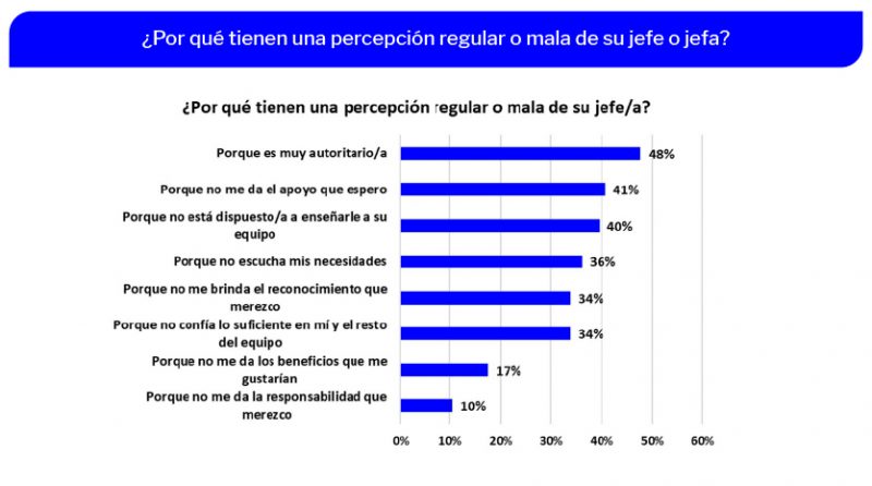 Entre quienes tienen una percepción negativa, el 48 % menciona que su jefe es muy autoritario; el 41 % indica que no le brinda el apoyo que esperaba y el 40 % afirma que no está dispuesto a enseñar al equipo.