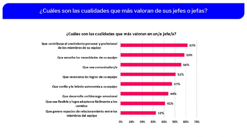 En cuanto a las cualidades más apreciadas en un jefe, el 62 % destaca el contribuir al crecimiento personal y profesional de los miembros del equipo, el 59 % resalta la importancia de escuchar las necesidades de los empleados, el 56 % valora la comunicación efectiva y el 51 % que reconozca los logros de su equipo.