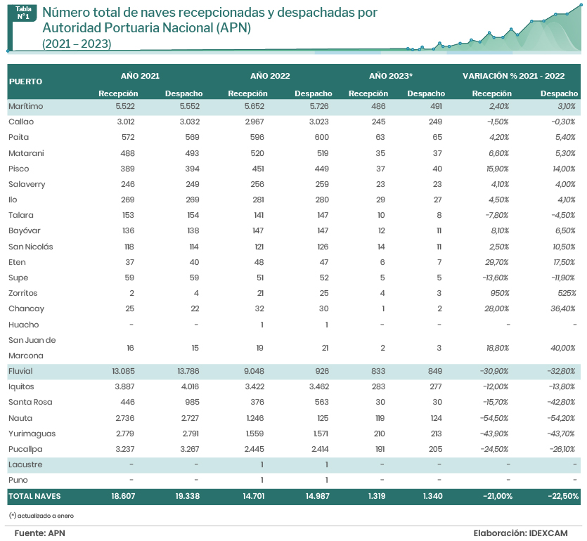 Durante el 2022, los puertos peruanos recibieron y despacharon 14.701 y 14.987 naves, respectivamente. Ello representó una disminución del 21% en naves recibidas con respecto al 2021.