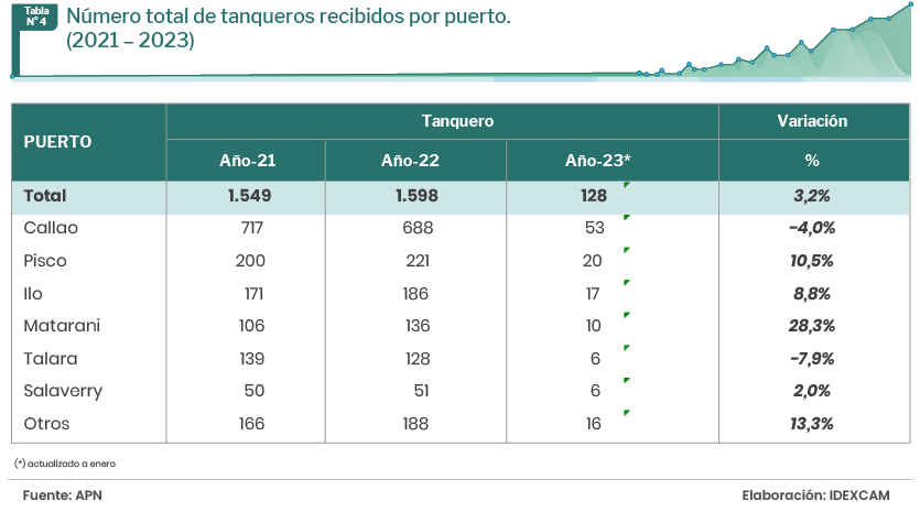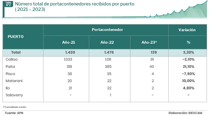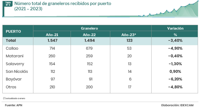 El Callao fue el principal puerto que atendió a este tipo de naves en 2022 al acumular el 45,4% del total. Le siguieron los puertos de Matarani y Salaverry, con el 17,3% y 10,2%, respectivamente.