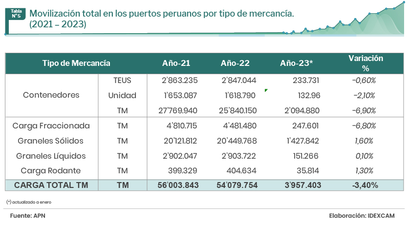Cabse señalar que el Terminal Portuario Matarani, administrado por Tisur, disminuyó su movimiento de granel sólido en 0,8% y aumentó su movimiento de carga fraccionada en 3% el 2022  versus el 2021. A su vez, el TNM Callao, administrado por APMTC, disminuyó su movimiento de carga fraccionada en 11,6% y redujo su movimiento de granel sólido en 4,5%, en el mismo período referido.
