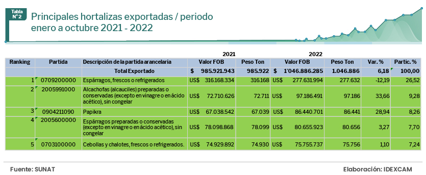 Respecto al subsector de hortalizas; la situación en el balance general de este subsector es positiva, aunque el crecimiento fue modesto, así llegó a crecer 6,14%, en los primeros 10 meses de año pasado respecto al mismo periodo del 2021. Aquí resaltan los espárragos frescos o refrigerados; las alcachofas en conserva (excepto en vinagre o en ácido acético), sin congelar; la páprika; los espárragos en conserva (excepto en vinagre o en ácido acético), sin congelar; las cebollas; y chalotes frescos o refrigerados; productos que representan el 59% del total exportado en hortalizas.