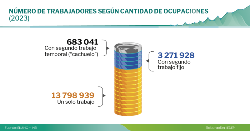 Tanto los trabajadores formales como informales recurren a esta práctica. En el caso de los trabajadores formales, el 13,5 % tiene una ocupación secundaria fija y el 2,9 % realiza “cachuelos”. Por otro lado, el 20,2 % de los trabajadores informales tiene una ocupación secundaria fija y el 4,2 % tiene una eventual.