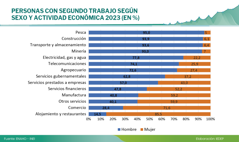 Un análisis por departamentos muestra que en Lima y La Libertad el número de mujeres con una ocupación secundaria supera al de hombres, mientras que en el resto del país la participación de los hombres es mayor.