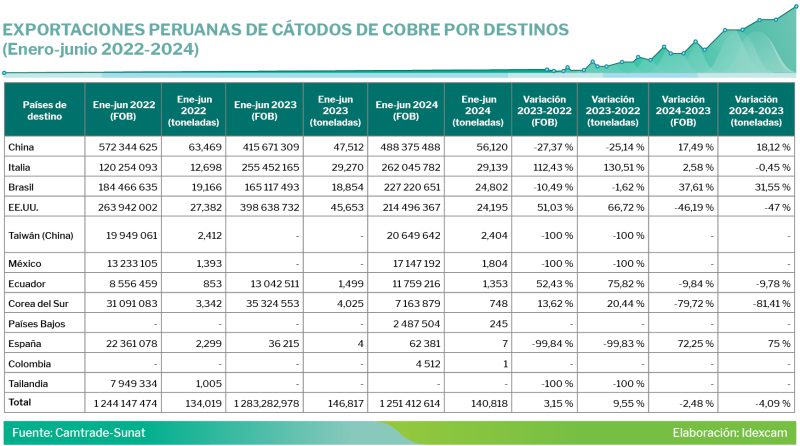 Exportaciones peruanas de cátodos de cobre por país de destino (enero-junio 2022 al 2024)