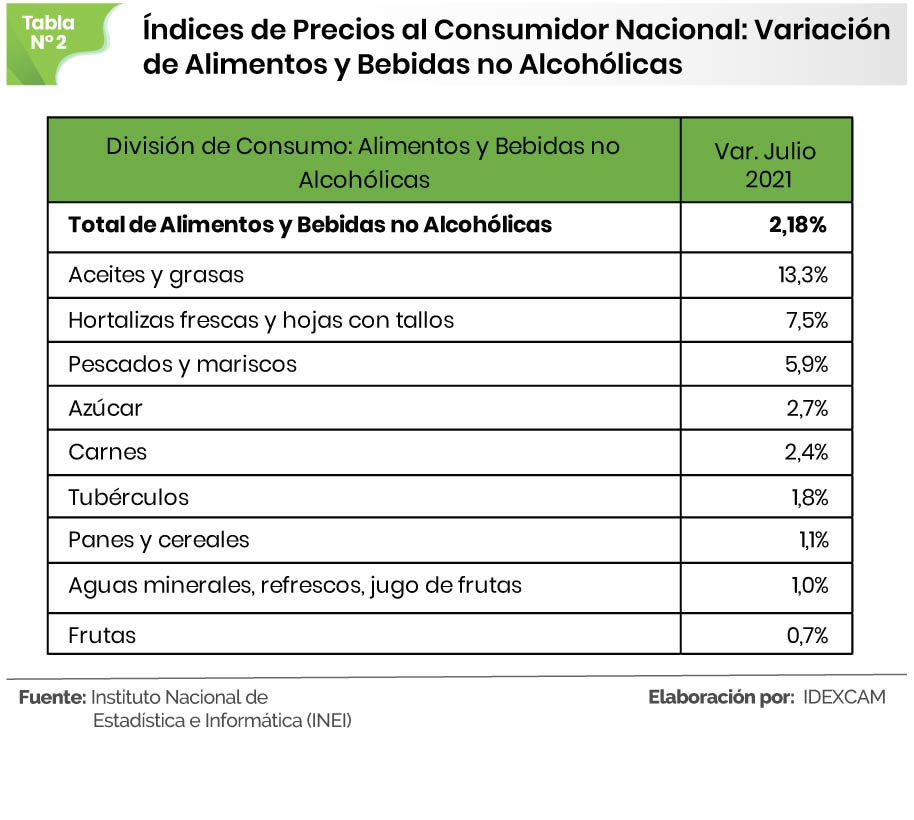 Durante julio, la variación en alimentos y bebidas no alcohólicas fue de 2,18%, resultado explicado por las alzas en aceites y grasas en el que destacan el aceite vegetal, el mayor precio internacional de su insumo principal (aceite crudo de soya) y el incremento del tipo de cambio, problemas climáticos en diferentes regiones productoras, afectando el abastecimiento de hortalizas frescas; la carne, debido a los mayores precios de importación del maíz amarillo duro y la soya, sumado al tipo de cambio que impactó en el precio del pollo eviscerado; además del alza en los precios del pescado, tubérculos, azúcar, pan y cereales, frutas, aguas minerales, bebidas gaseosas, entre otras bebidas.