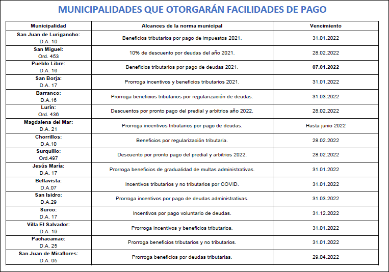 Las municipalidades que darán estas facilidades tributarias son: San Juan de Lurigancho, San Miguel, Pueblo Libre, San Borja, Barranco, Lurín, Magdalena del Mar, Chorrillos, Surquillo, Jesús María, Bellavista, San Isidro, Surco, Villa El Salvador, Pachacamac y San Juan de Miraflores.