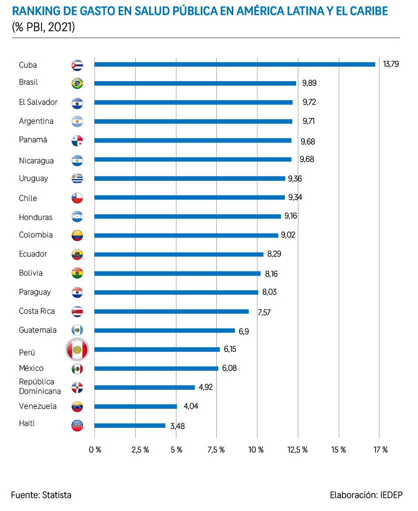 En comparación con otros países de América Latina, Perú destina un porcentaje del PBI a gasto en salud (6,15%) que se encuentra por debajo del promedio regional, el cual es de 8,15 %. Por ejemplo, en 2021, Brasil destinó el 9,89 % de su PBI al sector salud, Argentina el 9,71 %, y Chile el 9,34%.