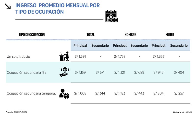 En tanto, aquellos con una ocupación secundaria temporal el ingreso es de S/ 1 352 (S/ 1 008 del principal + S/ 344 por cachuelos).