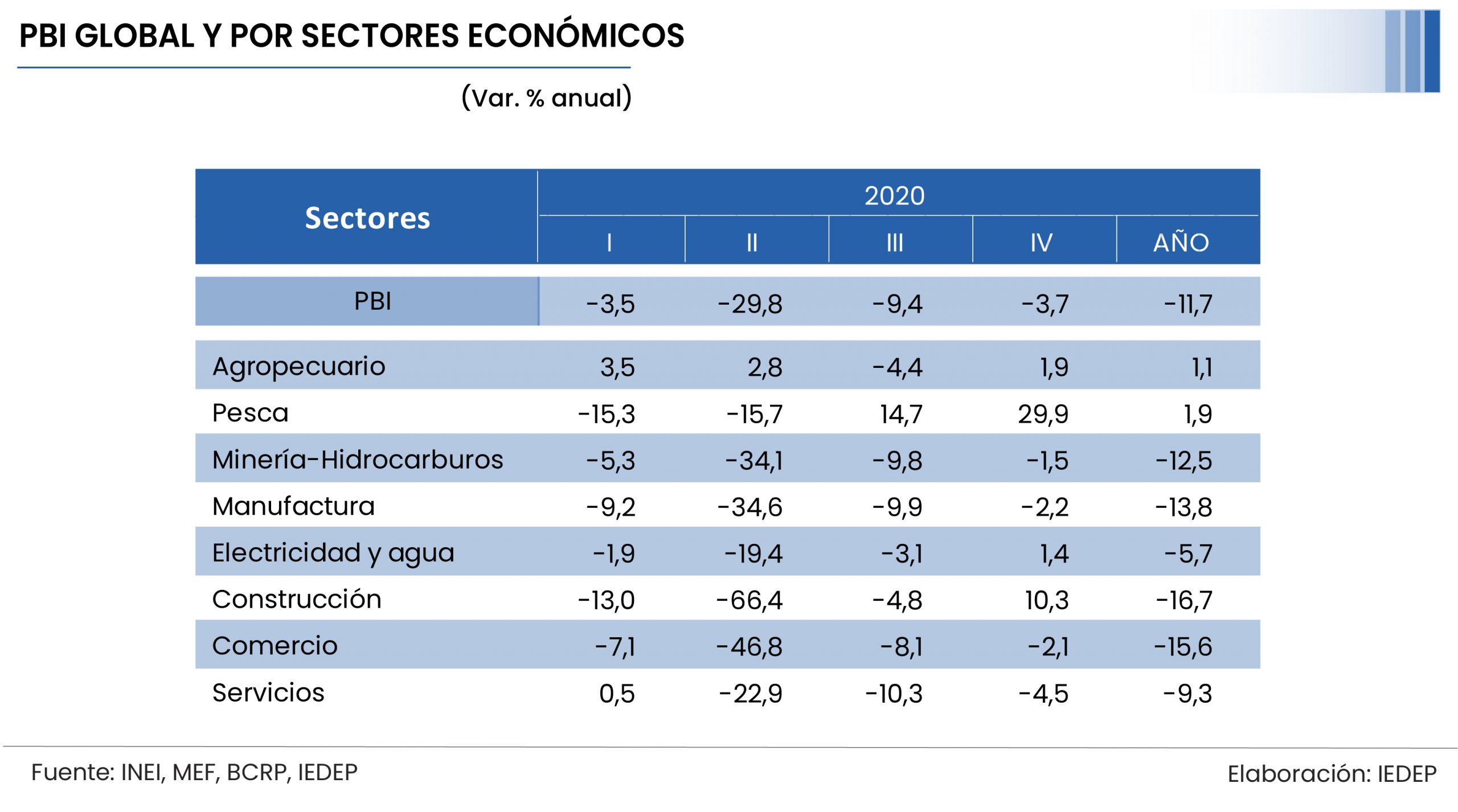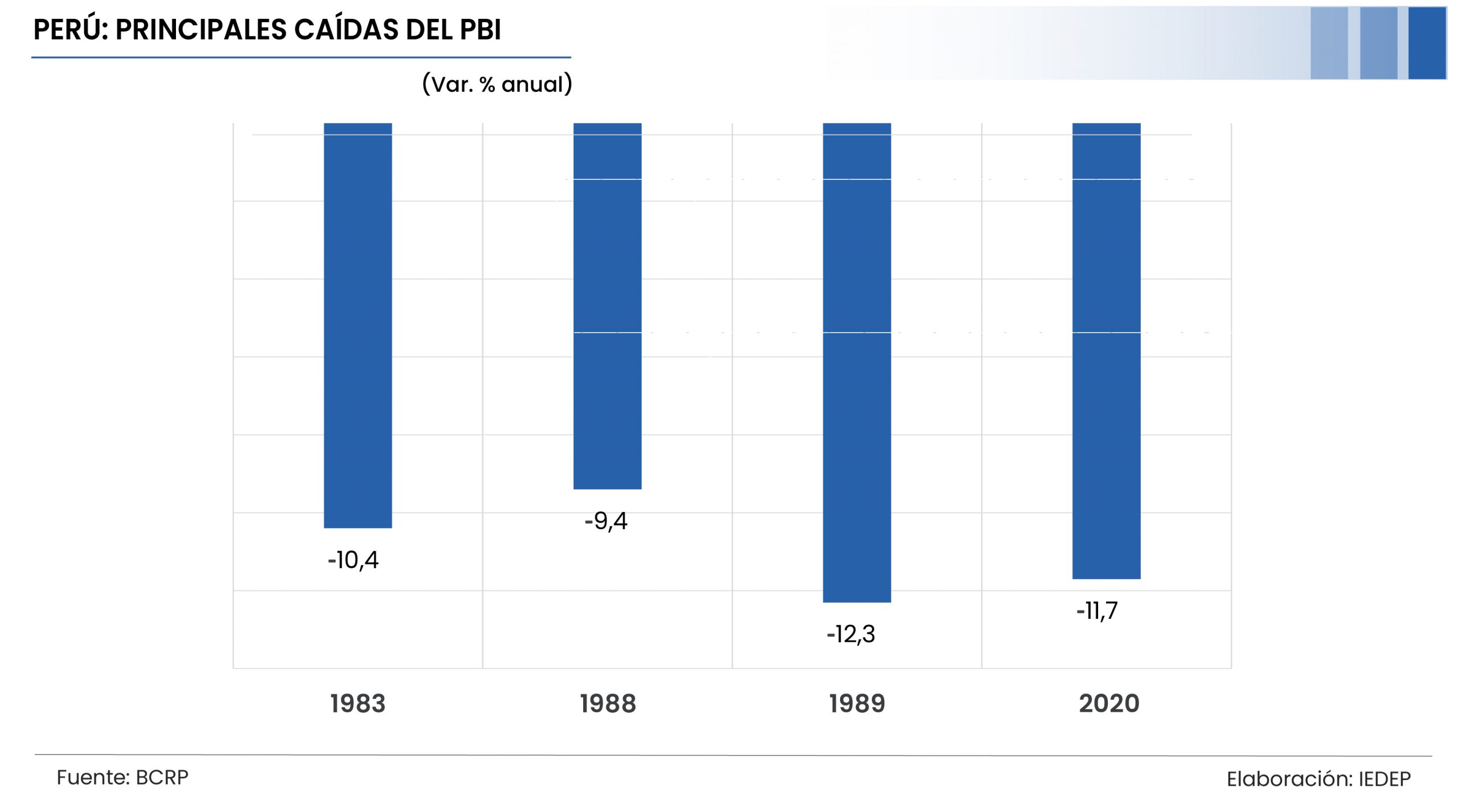 El Producto Bruto Interno (PBI) de Perú cerraría el 2020 con una caída de 11,7% respecto al 2019, por efectos de la pandemia provocada por la COVID-19, siendo el primer resultado negativo del presente siglo y solo superada por la recesión de -12,3% en 1989 en los últimos setenta años, informó el Instituto de Economía y Desarrollo Empresarial de la CCL (IEDEP).