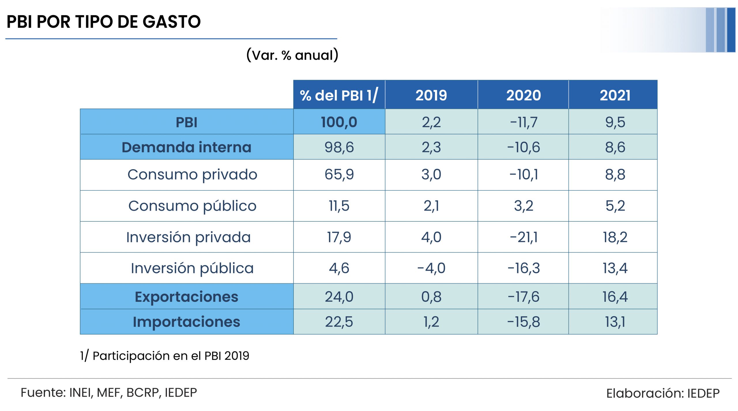 Por el lado del sector privado, el consumo se incrementaría en 8,8% y la inversión en 18,2%, que a pesar de ser tasas importantes no logran revertir la caída del año precedente. Sin embargo, al representar alrededor del 80% del PBI serán determinantes para la recuperación económica del 2021.