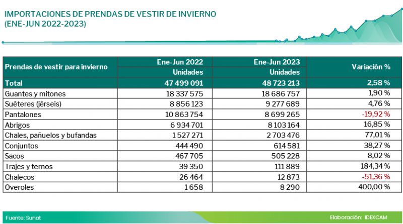 Según Sunat, en el primer semestre de 2023, las importaciones de prendas de vestir para invierno totalizaron alrededor de 49 000 000 de unidades, un aumento de 2,58 % con respecto a similar periodo de 2022.