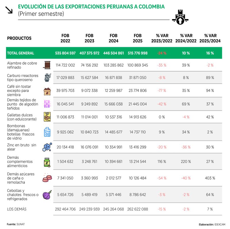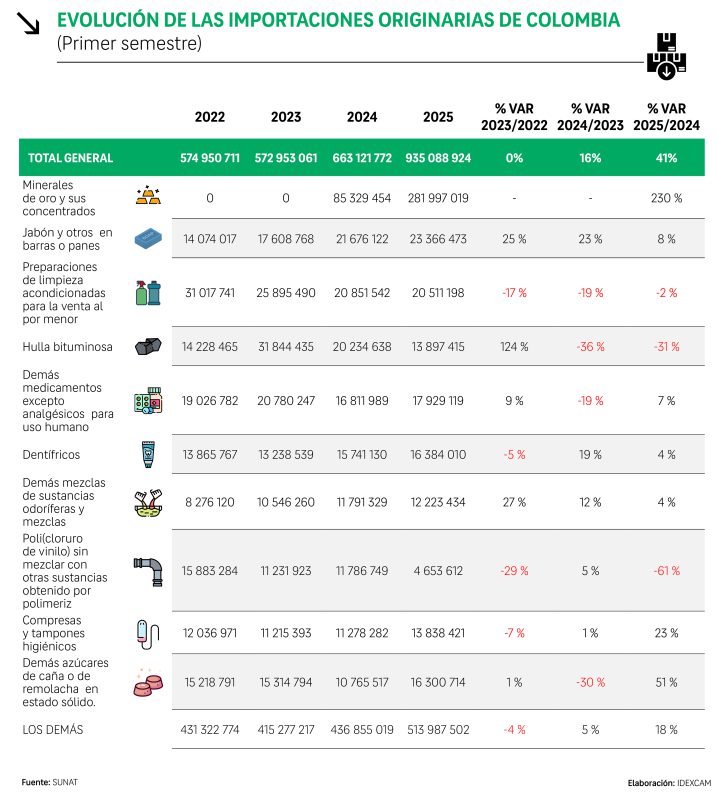 En el caso de las compras peruanas de productos colombianos, estas sumaron US$ 935 millones durante el primer semestre del 2025, un 41 % más que entre enero y junio del año pasado.