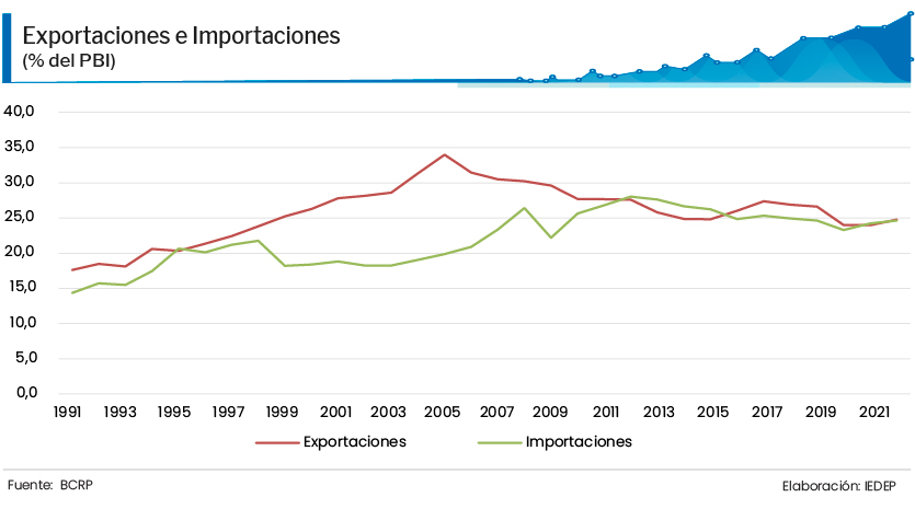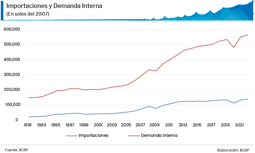 Las importaciones constituyen la oferta externa de productos, lo que se complementa con lo producido en el país para conformar la oferta global. Según el tipo de importación, los productos se pueden emplear como insumos o bienes intermedios para la producción o como bienes de consumo final. Por tanto, su evolución está influenciada por la evolución de la demanda interna y del PBI. Las importaciones también han mostrado un dinamismo y mayor importancia desde la liberalización comercial, al pasar de un 13,4% del PBI al inicio de los años noventa, hasta llegar a un 24,6% del PBI en el 2022.