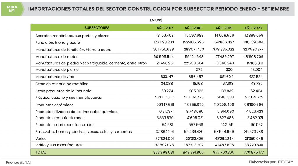 En materia de comercio exterior, el sector construcción también ha registrado un declive. Las importaciones de insumos y materia prima, que sirven como base para la mejora de esta industria, se han visto afectadas en estos nueve meses del año 2020.