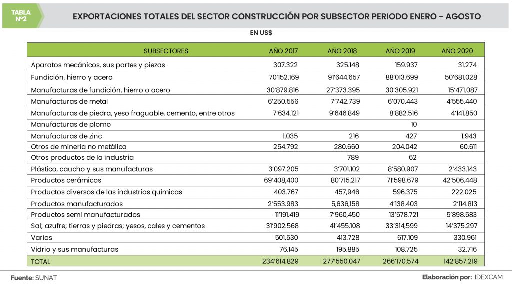 Las exportaciones también se vieron muy afectadas en los primeros ocho meses del 2020. Así, vemos que estas disminuyeron en 46% (observar tabla N°2).