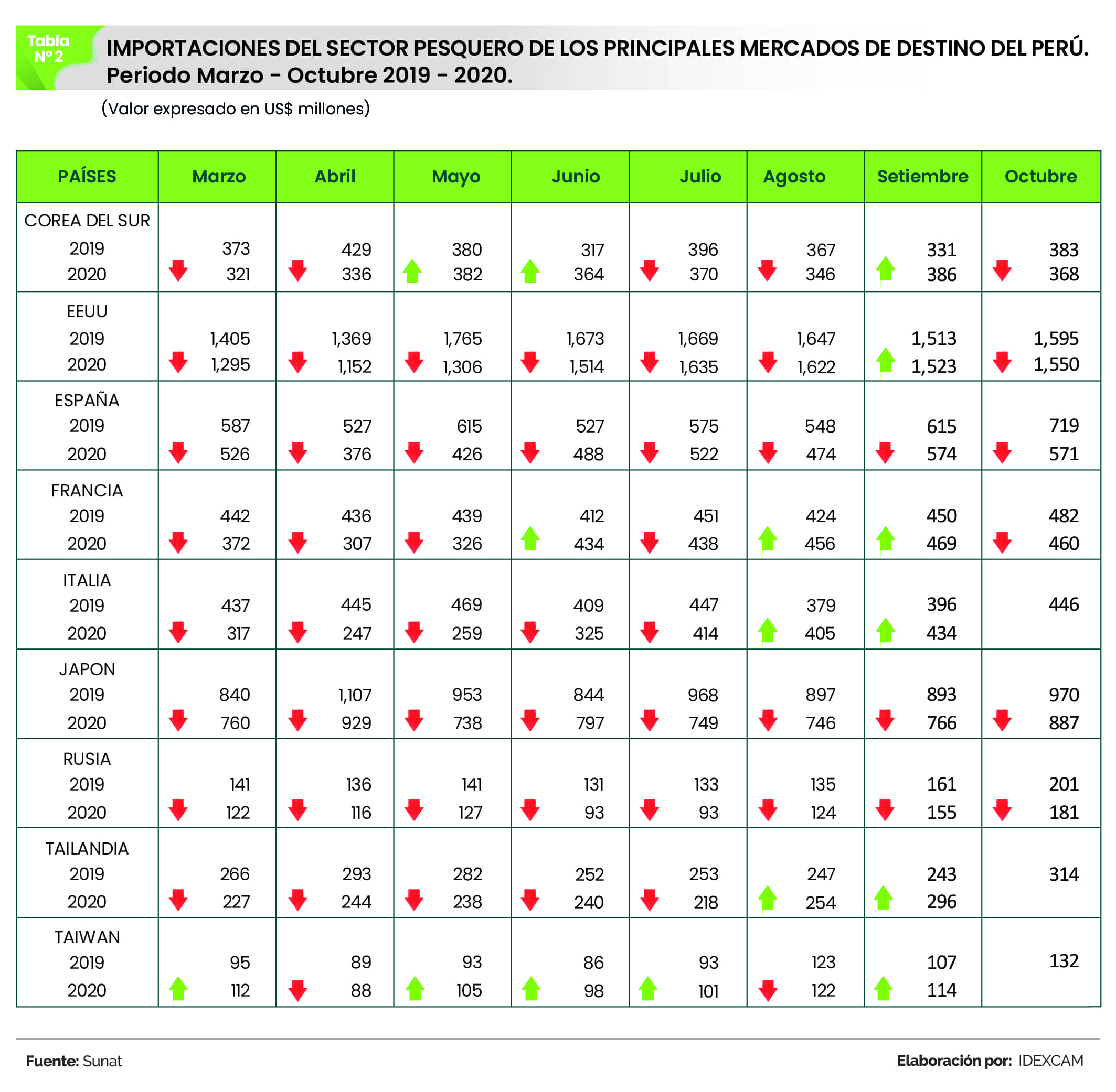 En este país el Perú paso del puesto 6 al 7 en los meses de pandemia, siendo superados por Argentina. Nuestros competidores en este país son China, que disminuyó sus exportaciones en 4%; Rusia (+8%); Vietnam (-3%); Noruega (+3%); EE.UU. (-10%); y Argentina (+65%).