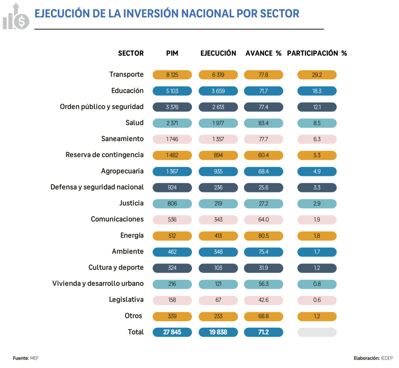 El análisis sectorial de la inversión del Gobierno Nacional refleja que, del total asignado para la ejecución de proyectos, se programaron S/ 27 845 millones, de los cuales se ejecutaron S/ 19 838 millones al 30 de noviembre de 2025, alcanzando un avance global cercano al 71.2 %. Su estructura presupuestal se concentra en Transporte, Educación, Orden Público y seguridad, Salud y Saneamiento quienes representan el 74.4 % del PIM nacional.