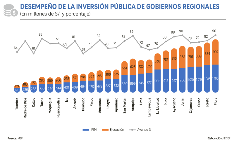 El avance del gasto de inversión de los Gobiernos Regionales al 30 de noviembre de 2025 muestra un desempeño heterogéneo, pero con resultados destacados en varios departamentos. Piura (90.2 %), Junín (89.9 %), Ayacucho (88.0 %) y Arequipa (89.1 %) lideran la ejecución, todos con niveles cercanos o superiores al 88 %, lo que refleja una gestión dinámica de sus proyectos, en particular en infraestructura vial, educativa y productiva. Otros departamentos como Tacna (84.8 %), Amazonas (82.5 %), San Martín (81.1 %) y Áncash (81.0 %) también muestran altos avances, acorde con la aceleración del gasto de inversión que caracteriza los últimos meses del año fiscal.