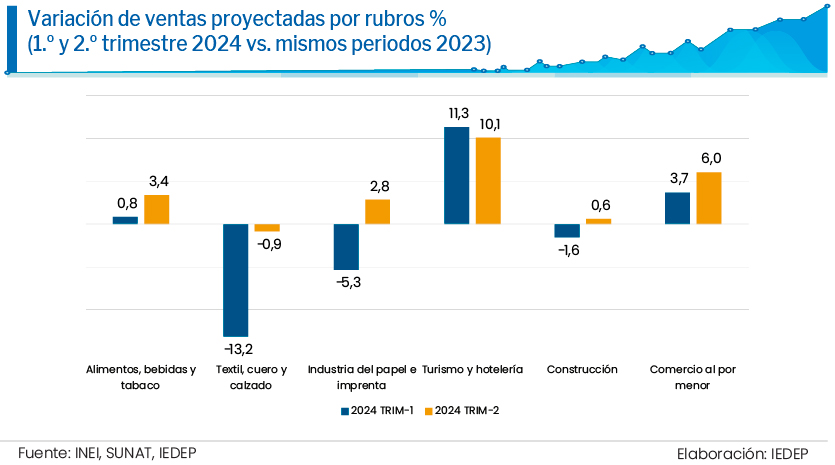 Otro rubro en el que se estiman mejoras en ventas es el turismo y la hotelería. Se proyecta que, para los dos primeros trimestres del año, sus ingresos aumenten en un 11,3 % y 10,1 %, respectivamente. De esta manera, retomarían el dinamismo que perdieron en los dos últimos trimestres de 2023, periodo en el cual sus ventas crecieron por debajo del 7,5 %.